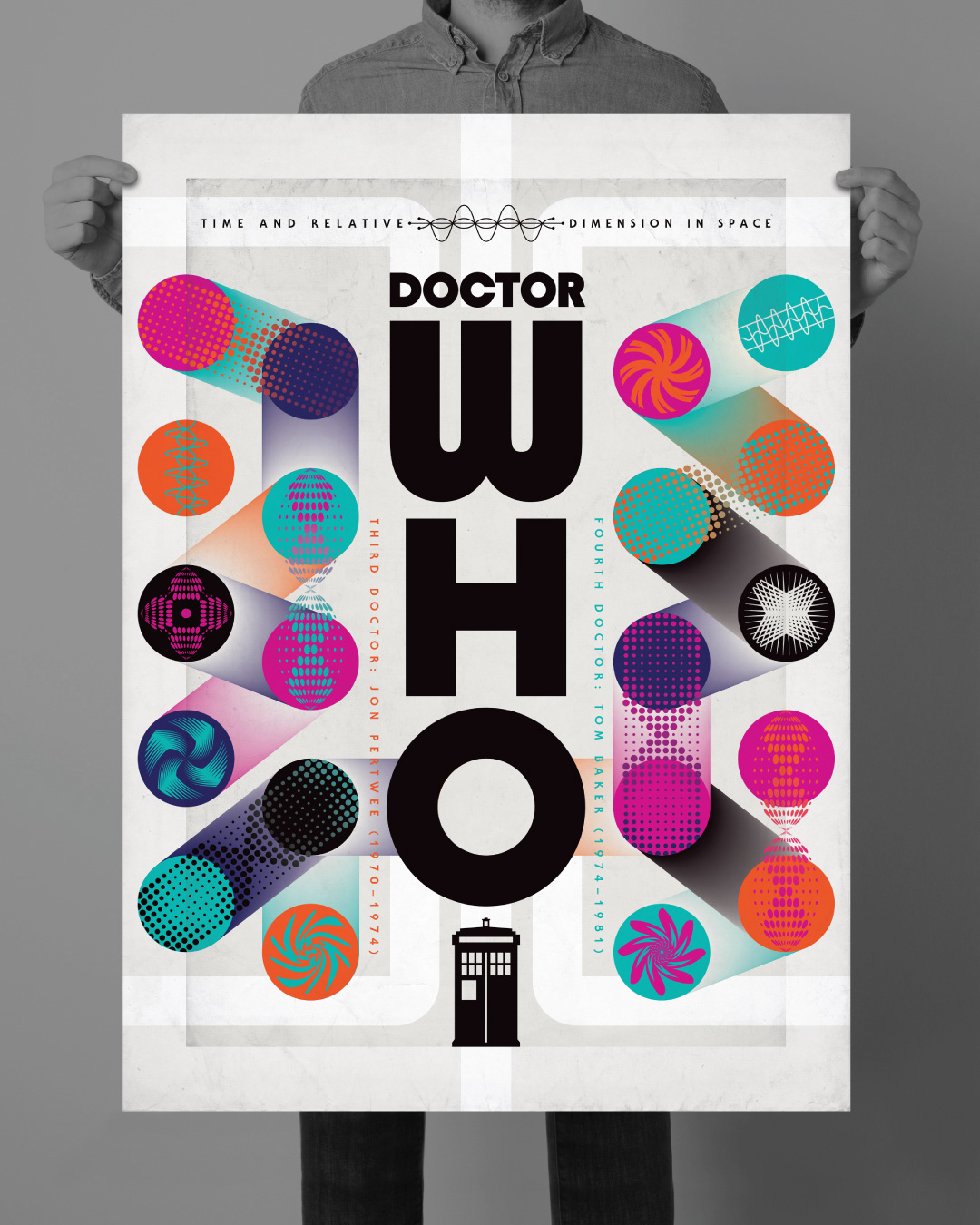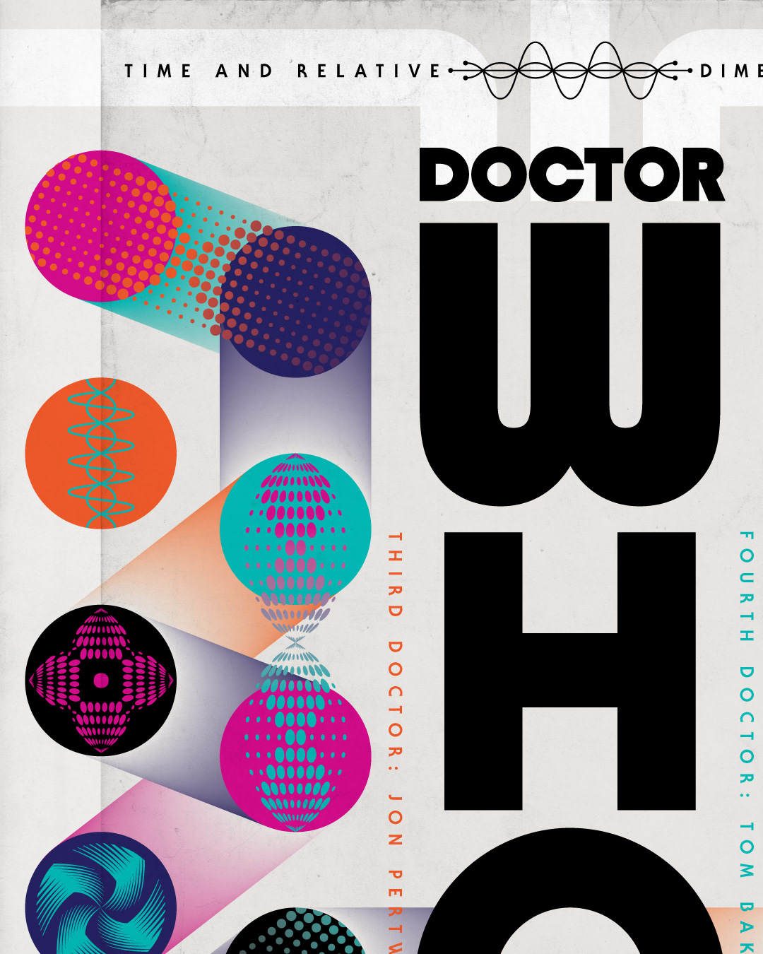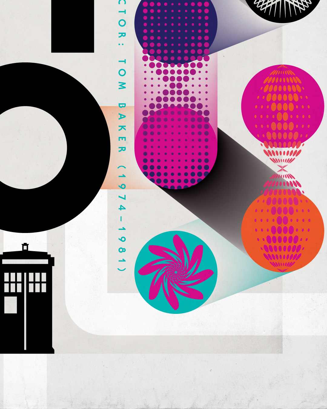 So, ‘my’ Doctors were Jon Pertwee and Tom Baker (showing my age here), 1970-81, and to be honest I didn’t watch Dr Who very much after that. But I still fondly remember the show from that time. I also remember that cool 70’s warped-colored-lights psychedelic intro to the show, so I let it inspire me abstractly for this latest TV tribute ‘poster’ design.
