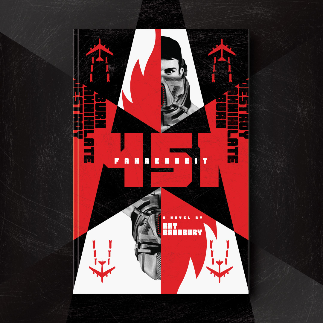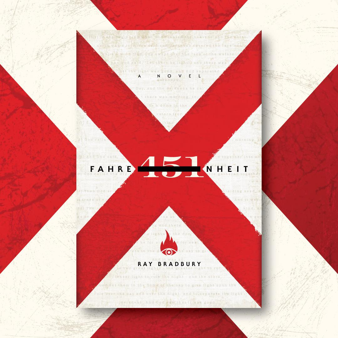 Fahrenheit 451, Ray Bradbury (1953). Conceptual cover designs for the sci-fi classic: Guy Montag is a fireman. In his world, where television rules and literature is on the brink of extinction, he starts fires rather than puts them out. He destroys the printed book, along with the houses in which they are hidden. He meets an eccentric young neighbor who introduces him to a past where people didn’t live in fear, and to a present where you can see the world through the ideas in books instead of the mindless television.
