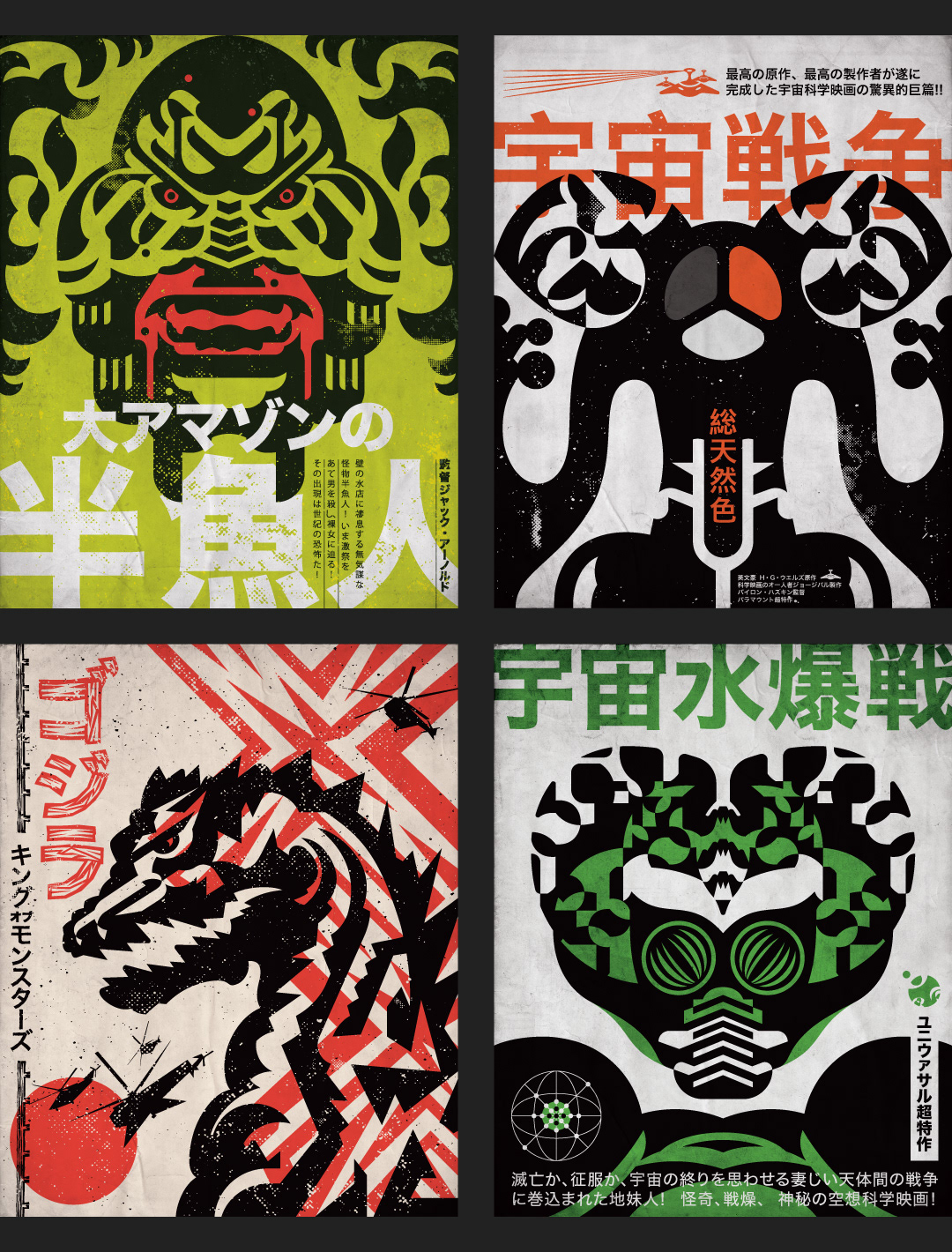 I've been working on a group of graphic posters based on classic movie monsters, with a Japanese influence. From top to bottom: They Live (1988), The Creature from the Black Lagoon (1954), The War of the Worlds (1953), Godzilla (1954), and This Island Earth (1955).