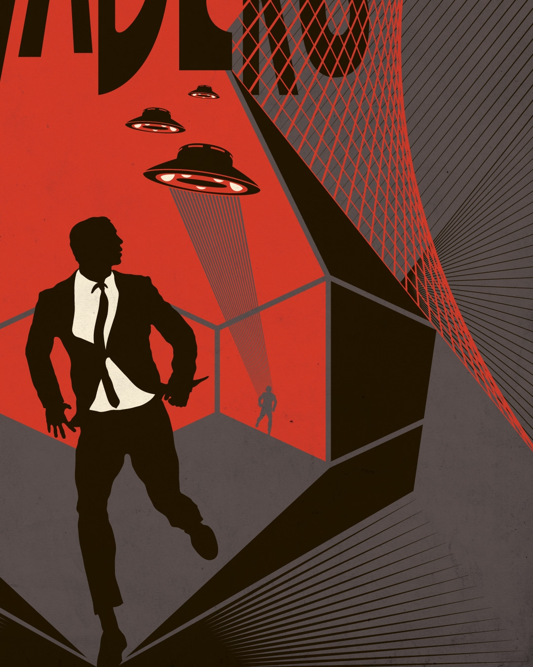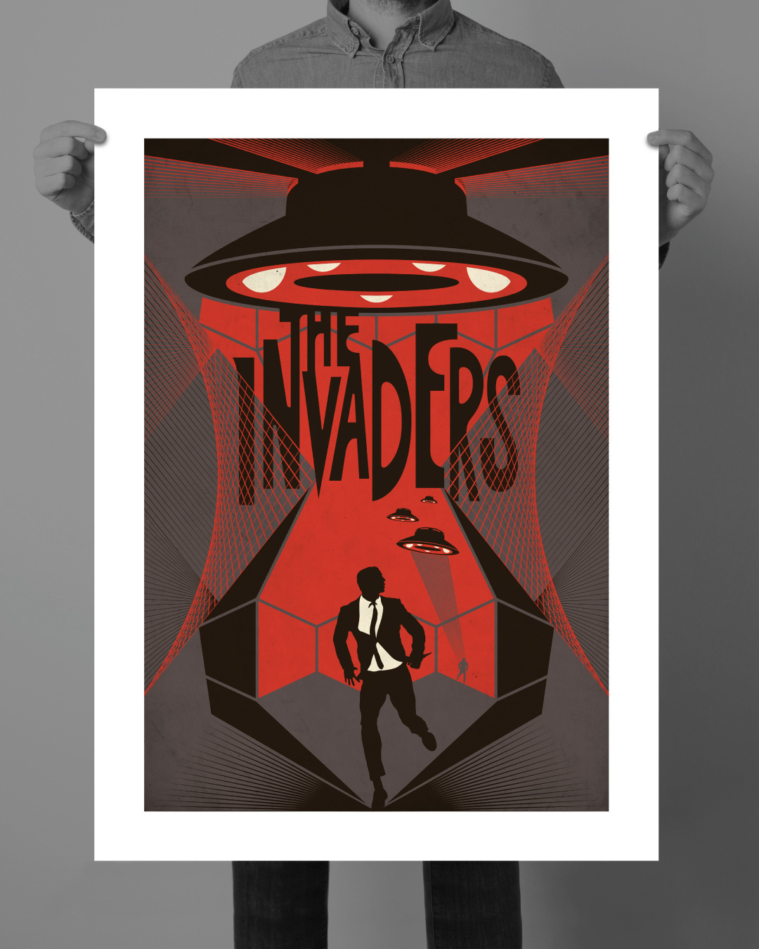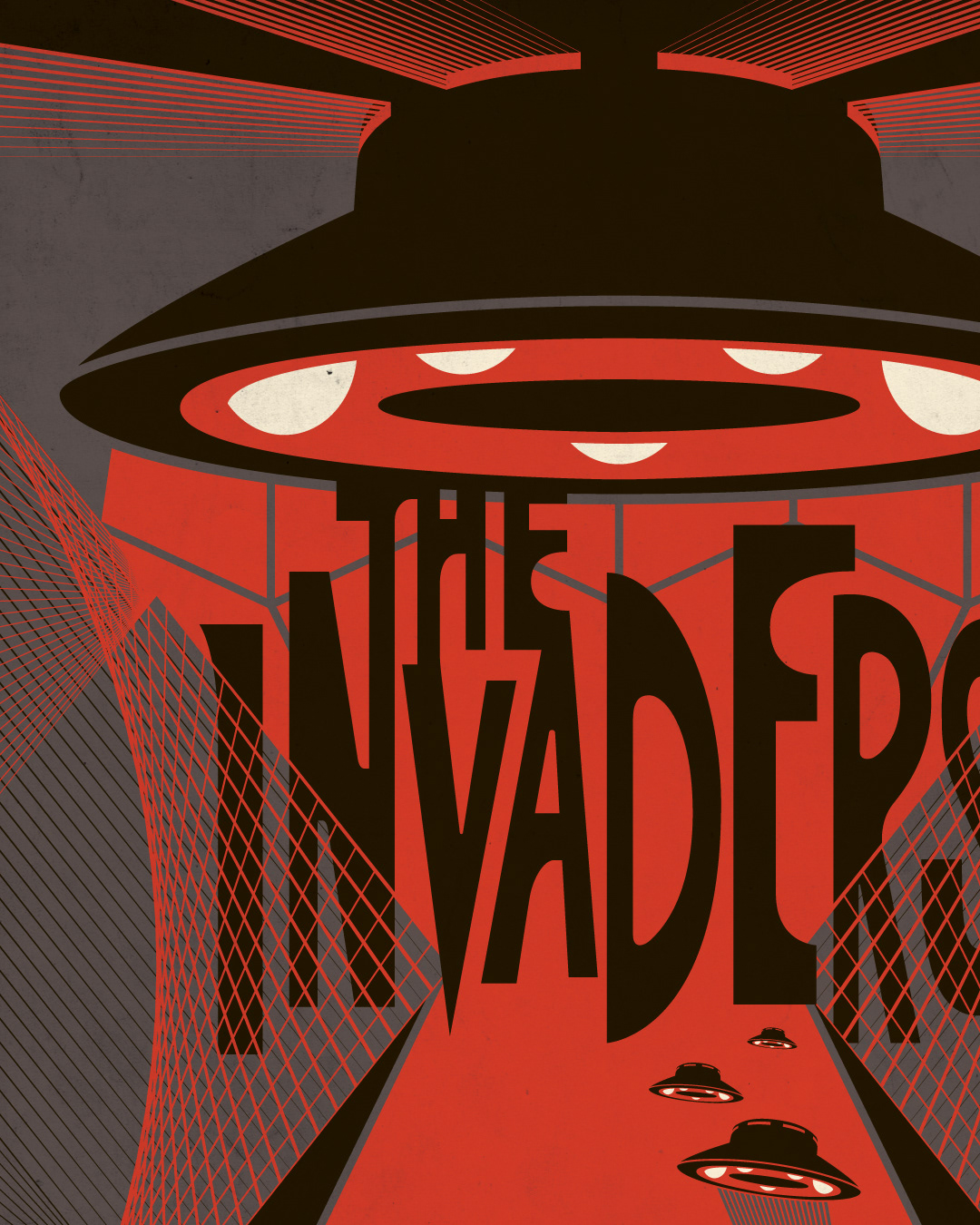 ‘The Invaders’ starring Roy Thinnes as ‘David Vincent’. After encountering a flying saucer and discovering an alien presence on Earth, Vincent seeks to compile evidence of the existence of the aliens and discover their plan. The hook was that he always had the evidence in his grasp but at the last second it was taken away. Kind of like a 1960’s frustrated Fox Mulder crossed with ‘The Fugitive’. Pretty cool show. LOVED the funky 60’s typography of the show ‘logo’, so couldn’t resist emulating that, along with the ever running Vincent, the mind control crystal and of course the cool flying saucers.