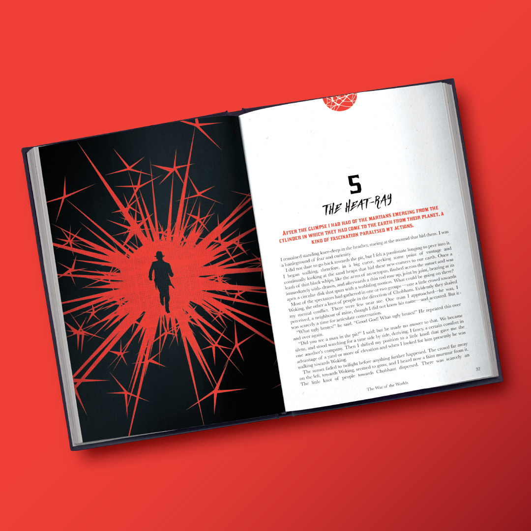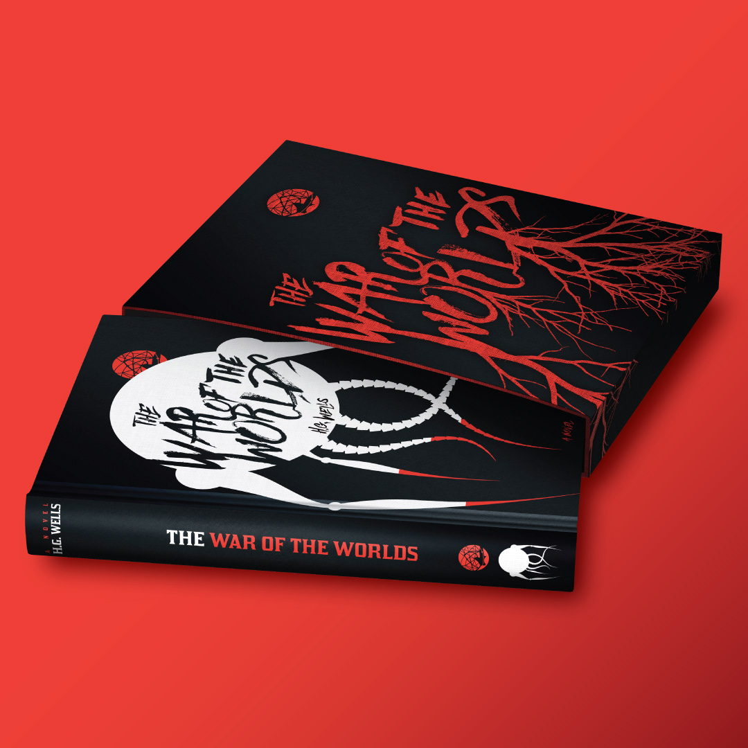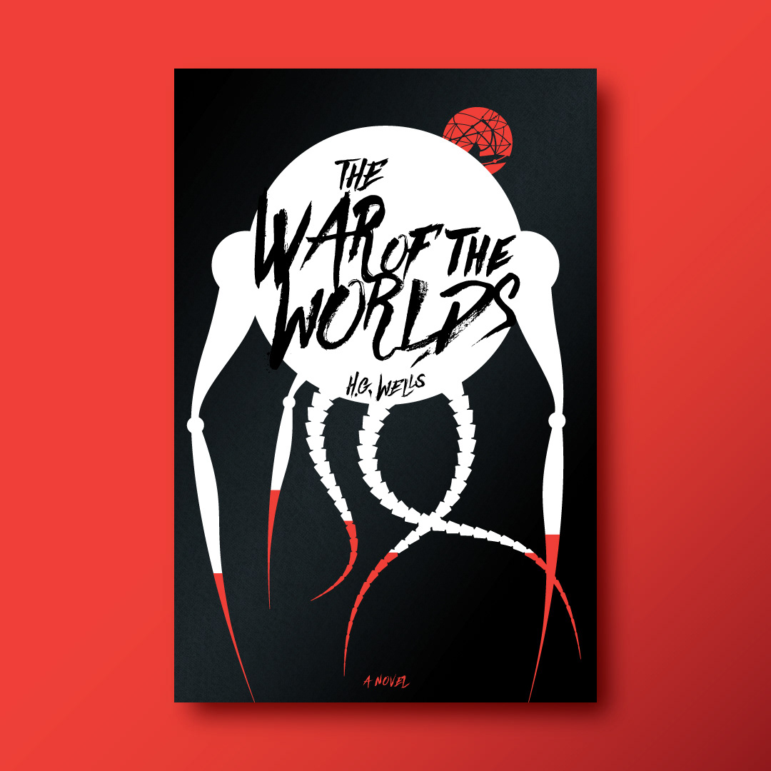 The War of the Worlds, H.G. Wells (1897). Conceptual cover design, sleeve and interior design for the sci-fi classic: Unearthly creatures arrive in huge cylinders, the first is regarded as a curiosity rather than a danger until the Martians climb out of it and kill many of the gathered crowd with a unknown weapon. As the Martians manipulate two terrifying machines they are as versatile as humans and at the same time invincible. The inhabitants of Earth seem powerless, but there is one factor which the Martians have not reckoned on.